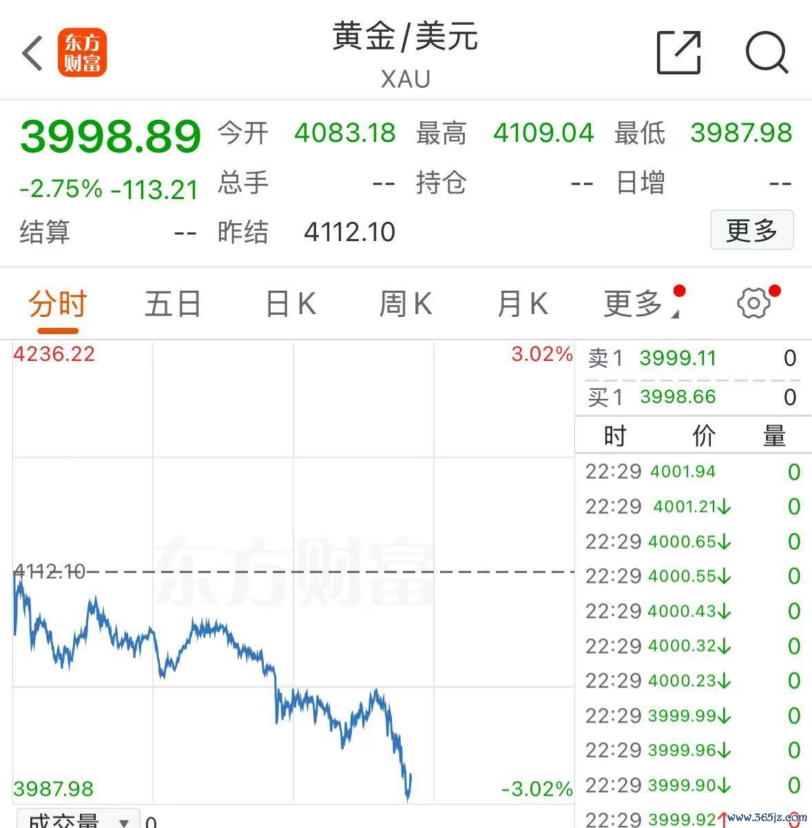 北京时间10月27日晚,现货黄金一路走低,向下跌破4000美元/盎司,为10月10日以来首次,日内跌幅扩大至2.75%。