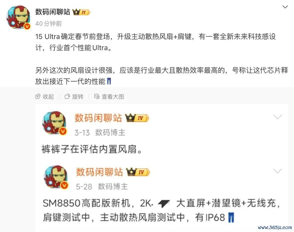 细节规格方面,以往的消息显示,Ultra版本或采用2K LIPO直屏,搭载第五代骁龙 8 至尊版,配备潜望长焦,支持无线充,内置主动散热风扇,支持IP68级防尘防水。